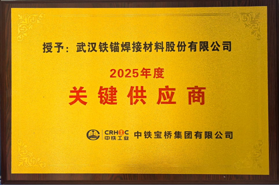 近日,中船武汉船机旗下铁锚焊材凭借过硬的产品品质、可靠的供应保障以及深度的技术协作,荣获中铁宝桥集团有限公司“2025年度关键供应商”称号,这是该公司连续第二年获此殊荣。这份荣誉不仅是对双方长期战略合作成果的充分认可,更印证了铁锚焊材在桥梁焊接材料领域的雄厚实力。